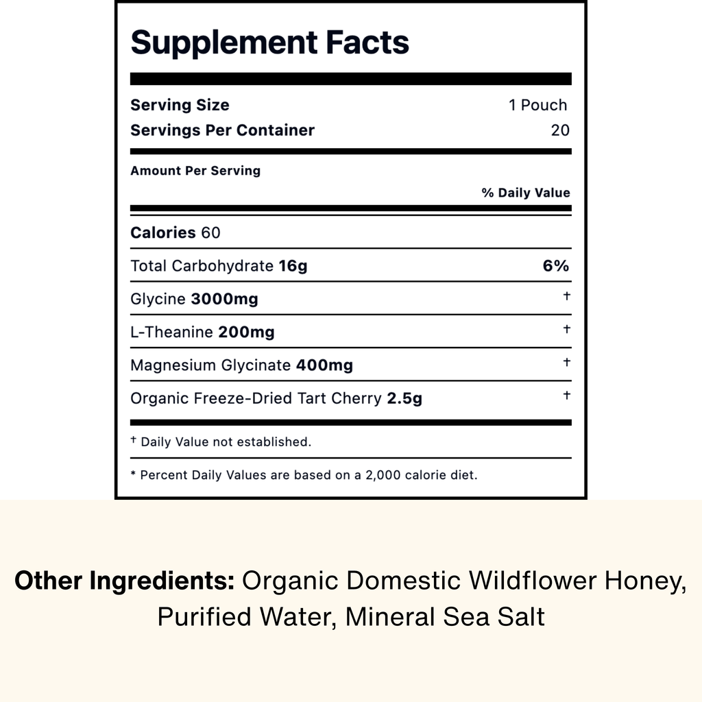 Most sleep aids rely on synthetic melatonin or heavy sedatives. Hibernation Honey uses real-food ingredients—raw honey, freeze-dried tart cherry, glycine, L-theanine, and magnesium glycinate—to help your body naturally produce and sustain deep sleep. No crash. No dependency.